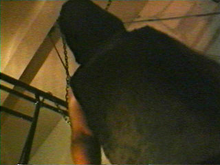 The woman's wrists are bound together in shackles,