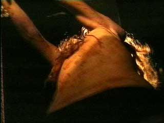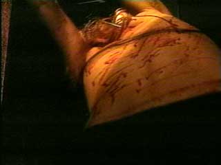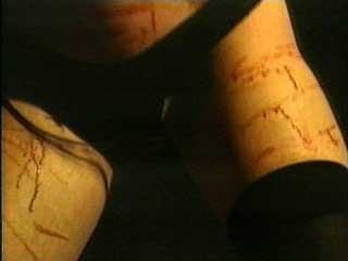 in the mirror, her back bloodied, her legs tense, her